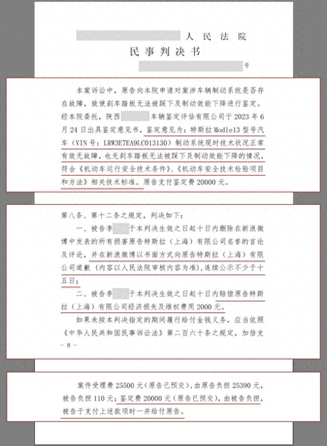 最终,法院一审判决该自媒体在其抖音发布道歉声明并置顶 30 日,向特斯拉公司赔礼道歉、消除影响、恢复名誉,并赔偿特斯拉 30,000 元。