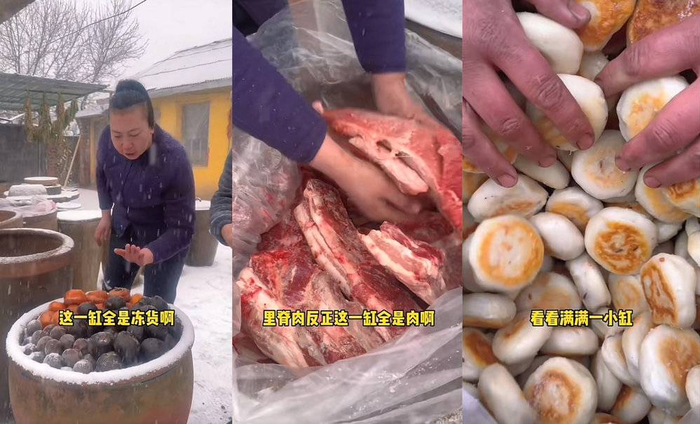 冬天是东北人的主场,雨姐展示自家的天然冰箱:每一口大缸里存放着冻好的海鲜、猪肉、冻海带和冻豆腐、腌好的咸菜、塞得满满的火烧和煎饼、还有东北特色甜品冻梨冻柿子。在大雪埋到脚脖子的深冬,这些食物可以一直存放到春天。
