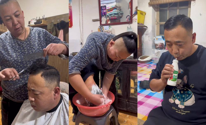 镜头里的雨姐先是利利索索给自己理了发,然后把老蒯一把按在椅子上,理完发又把老蒯摁在椅子上洗头,老蒯被热水烫得呲牙咧嘴。洗完头之后,雨姐给老蒯递上一瓶AD钙奶。这套流程,像极了小时候嫌洗脸水太烫的你,和拿着毛巾往你脸蛋上招呼的亲妈。