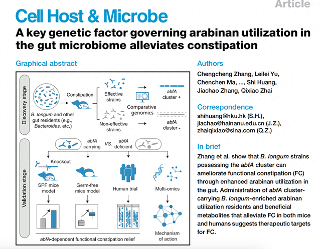 新发现,拥有abfA基因簇的长双歧杆菌菌株,会增强对肠道中被称为“阿拉伯糖”难消化纤维的利用,以此来改善便秘。相关论文已于当地时间11月22日刊登在细胞出版社旗下刊物——《细胞·宿主和微生物》(Cell Host & Microbe)。