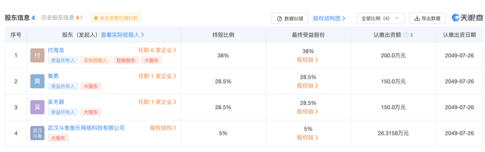 “长沙乡村敢死队”隶属于湖南鱼小丸网络科技有限公司,天眼查信息显示,武汉斗鱼鱼乐作为股东持股4%。此外,工商信息显示,2020年7月1日,成都九途文化传媒有限公司发生投资人(股权)变更,武汉斗鱼鱼乐网络科技有限公司认缴26万元注册资本、占股5%,而主播付海龙为该公司大股东持股38%。这两家公司均为存续状态。
