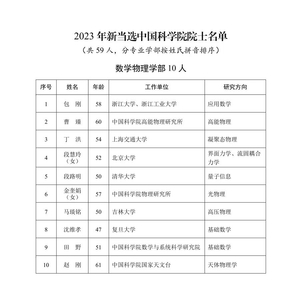 在增选的59名中国科学院院士中,数学物理学部10人,化学部10人,生命科学和医学学部11人,地学部8人,信息技术科学部8人,技术科学部12人。新当选院士平均年龄54.7岁,最小年龄45岁,最大年龄65岁,60岁(含)以下的占90%。女性科学家有5人当选。本次增选后,现有中国科学院院士共873人。