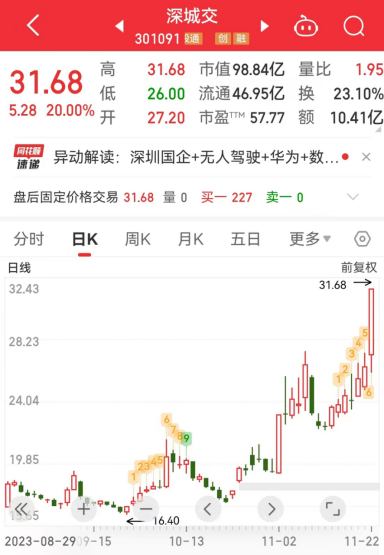 深城交是深圳国资旗下老牌房地产企业。去年11月,对于荣耀借壳的传言,深城交也曾在深交所互动易回复投资者提问时表示,公司与荣耀公司当前未有业务往来及合作。另外,深城交还叠加工程咨询服务、数据要素、智慧政务、智慧城市、新型城镇化、信创、大数据、车联网、智能驾驶等多个概念,今年11月以来,其股价累计大涨63.22%,创历史新高,最新市值98.84亿元。