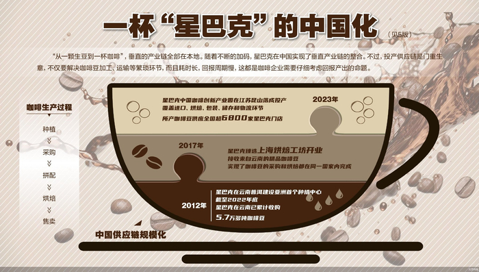 2020年3月,星巴克中国宣布在江苏昆山投资建造产业园,2023年9月19日,一座外墙印有巨大咖啡浆果图案的工厂正式落成投产。三年时间,星巴克中国建成的远不只是一座占地80000平方米的工厂,而是在中国市场实现了咖啡豆进口、烘焙、物流等全部环节。简而言之,对于消费者而言,未来星巴克中国门店的咖啡豆将更新鲜。对于星巴克而言,无论是运输半径还是配送效率都有了质的改善。