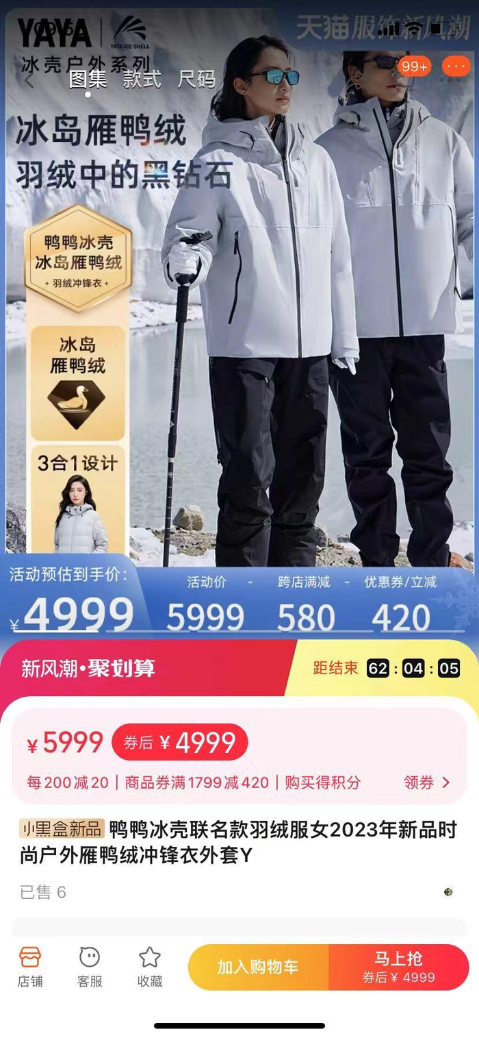 记者在鸭鸭官方旗舰店发现,一款新推出的羽绒服产品销售价格标价5999元实则售价4999元。产品介绍页面显示该羽绒服为“全球第一件冰岛雁鸭绒高奢羽绒服”,商家称“冰岛雁鸭”是全球珍稀保护动物,其绒毛为羽绒中的黑钻石。即使售价高昂,在商品页面依然显示有6件销量。