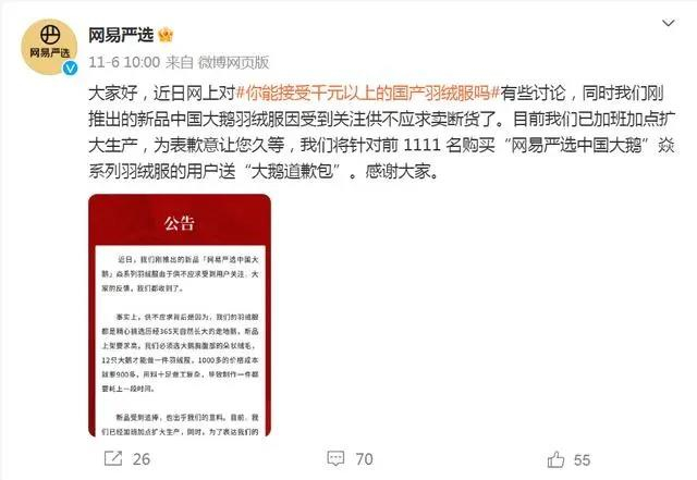 在不久前,网易严选推出的一款定价在999元-1399元的羽绒服卖断了货,但该产品因为定价高而受到争议,网易严选回应称:售价1000多元的羽绒服成本价就在900余元,要薅12只大鹅才能做一件羽绒服。