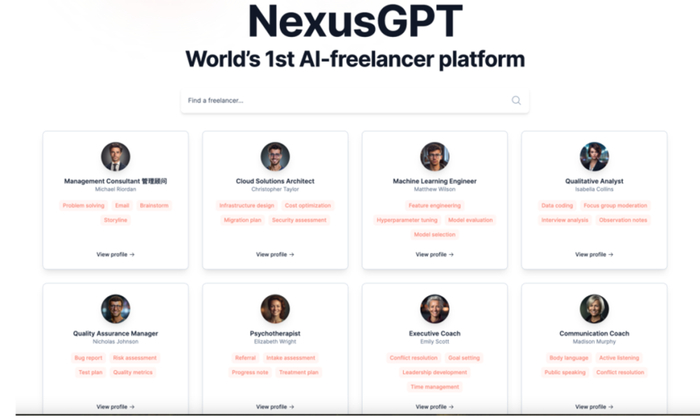 又如,号称是世界上第一个AI自由职业者平台的NexusGPT[8]。该平台整合了开源数据库中的各种AI原生数据,并拥有800多个具有特定技能的AI智能体。在这个平台上,你可以找到不同领域的专家,例如设计师、咨询顾问、销售代表等。雇主可以随时在这个平台上选择一个AI智能体帮助他们完成各种任务。