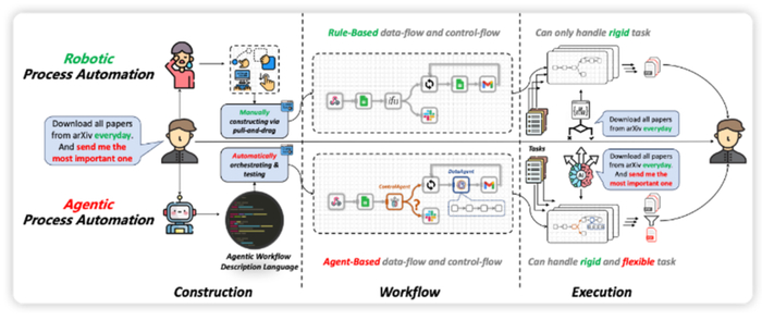 [13]过去RPA仅能替代简单、机械的人力工作,一些复杂的流程仍旧依赖人工,存在两大难题:编写RPA工作流本身需要繁重的人类劳动,成本较高;复杂任务非常灵活,通常涉及动态决策,难以固化为规则进行表示。而在APA范式中,Agent可以根据人类的需求自主完成工作流构建,同时其可以识别人类需求中需要动态决策的部分,将自动编排进工作流中,并在工作流执行到该部分时主动接管工作流的执行完成相应复杂决策。