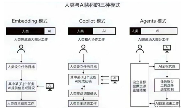 从前文对智能体记忆、规划、行动和使用工具四个主要模块的功能分析来看,智能体模式相较于嵌入模式、副驾驶模式无疑更为高效,或将成为未来人机协同的主要模式。