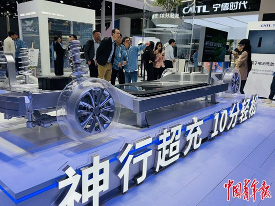 “这款神行超充电池可实现‘充电10分钟,续航400公里。”“冬季天冷的时候也能实现快充。”在宁德时代展台,不少观众一边仔细观看展品,一边向工作人员询问性能参数。
