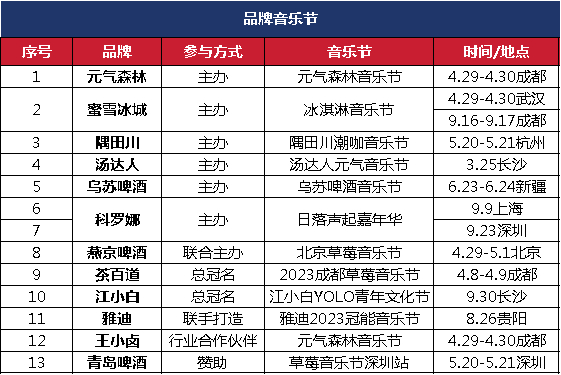 这几年很多品牌都开始布局音乐节营销,比如元气森林、隅田川、蜜雪冰城、汤达人、同程旅行、爱玛、喜力、燕京啤酒等。