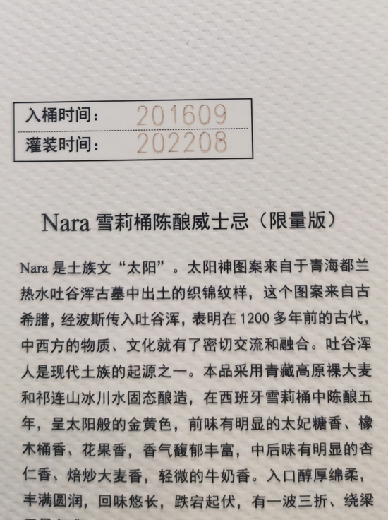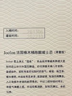 但3款酒的外包装显示,“Nara”、“Sulongghu”的入桶时间为2016年,灌装时间为2022年,酒龄实际为6年;“Joolon”的入桶时间为2013年,灌装时间为2022年,酒龄实际为9年。