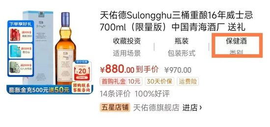 此外,在京东的产品类别上,3款产品均展示为保健酒,而包装显示适用的标准代号为GB/T 11857《威士忌》国标。对此笔者询问了官方店客服,其表示“因京东后台类目问题出现该情况,已暂时下架联系京东重新设置”,随后产品已无法被搜索到。