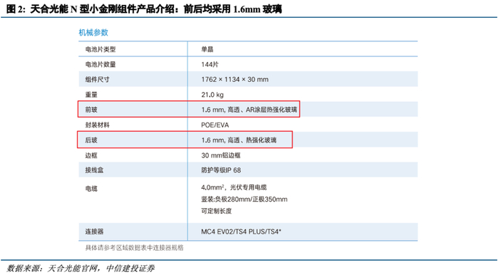 但组件大尺寸化+屋顶光伏适应场景增加,对组件轻量化也提出要求,而减薄玻璃是目前的思路之一。尽管玻璃封装可靠性较高,但双玻2*2.0mm玻璃方案相比单玻1*3.2mm方案,每平方米增加的重量约为2kg,参考当前组件平均面积2平方米左右,双玻组件相对单玻组件重量将增加4kg左右,搬运、安装的难度均会加大,而将玻璃在现有的2.0mm基础上进一步减薄则是目前主流的解决方案之一,参考天合N型小金刚组件(小尺寸组件),目前已经有1.6mm双玻组件,主要针对住宅、工商业屋顶市场。