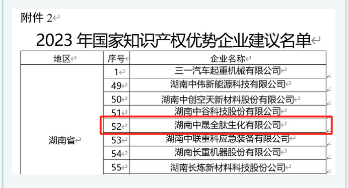 近日,国家知识产权局官网发布《关于2023年度国家知识产权优势企业和示范企业评定结果的公示》,湖南中晟全肽生化有限公司 (现更名为湖南中晟全肽生物科技股份有限公司)荣获“2023年度国家知识产权优势企业”称号。