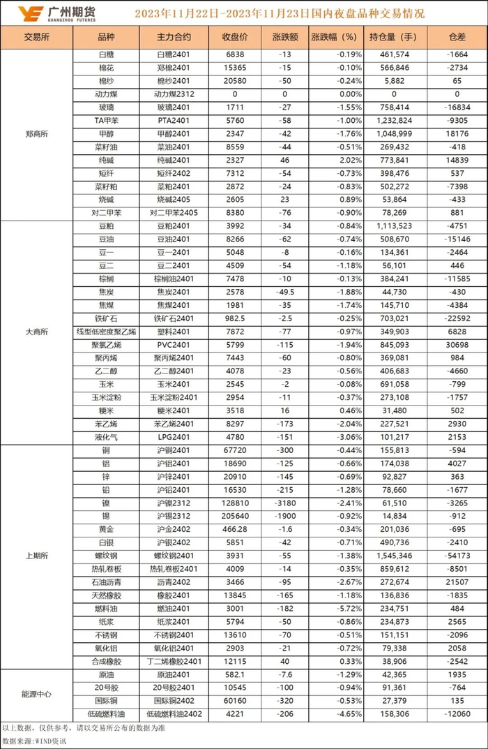 美元指数上涨0.25%至103.87,美十债收益率涨1.4bp至4.41%,沪金、沪银小幅下跌。美国11月密歇根大学消费者信心指数终值录得61.3,一年期通胀预期4.5%,长期通胀预期3.2%,均较初值小幅上修。欧央行官员讲话表态偏鹰,欧央行副行长金多斯表示,投资者可能没有完全消化欧元区经济可能受到更大冲击的风险,目前考虑降息有点为时过早。欧洲央行管委内格尔称,已接近终端利率水平,预计将在当前利率水平维持一段时间,无法确定欧央行是否会再次加息;目前仍存在一些可能引发通胀的风险因素。后续美国经济存在下行风险,中长线角度仍相对看好贵金属价格表现,建议沪金、沪银逢低做多。