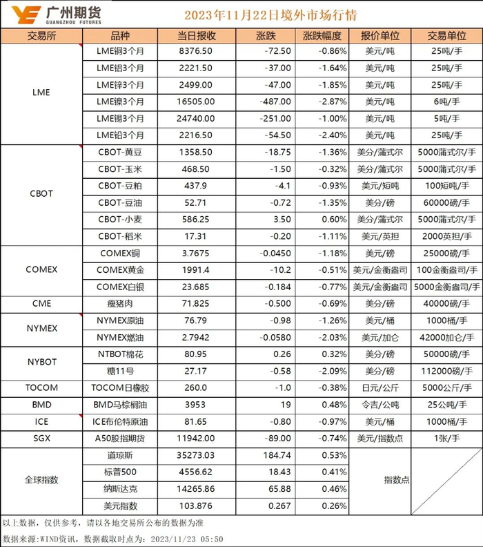 (2)库存:11月22日,SHFE仓单库存3256吨,减326吨;LME仓单库存179050吨,增25吨。
