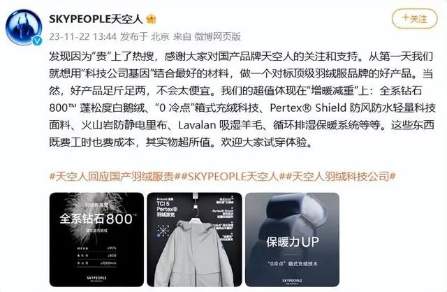 对于“贵上热搜”,SKYPEOPLE天空人在官方微博回应称:“好产品足斤足两,不会太便宜。”