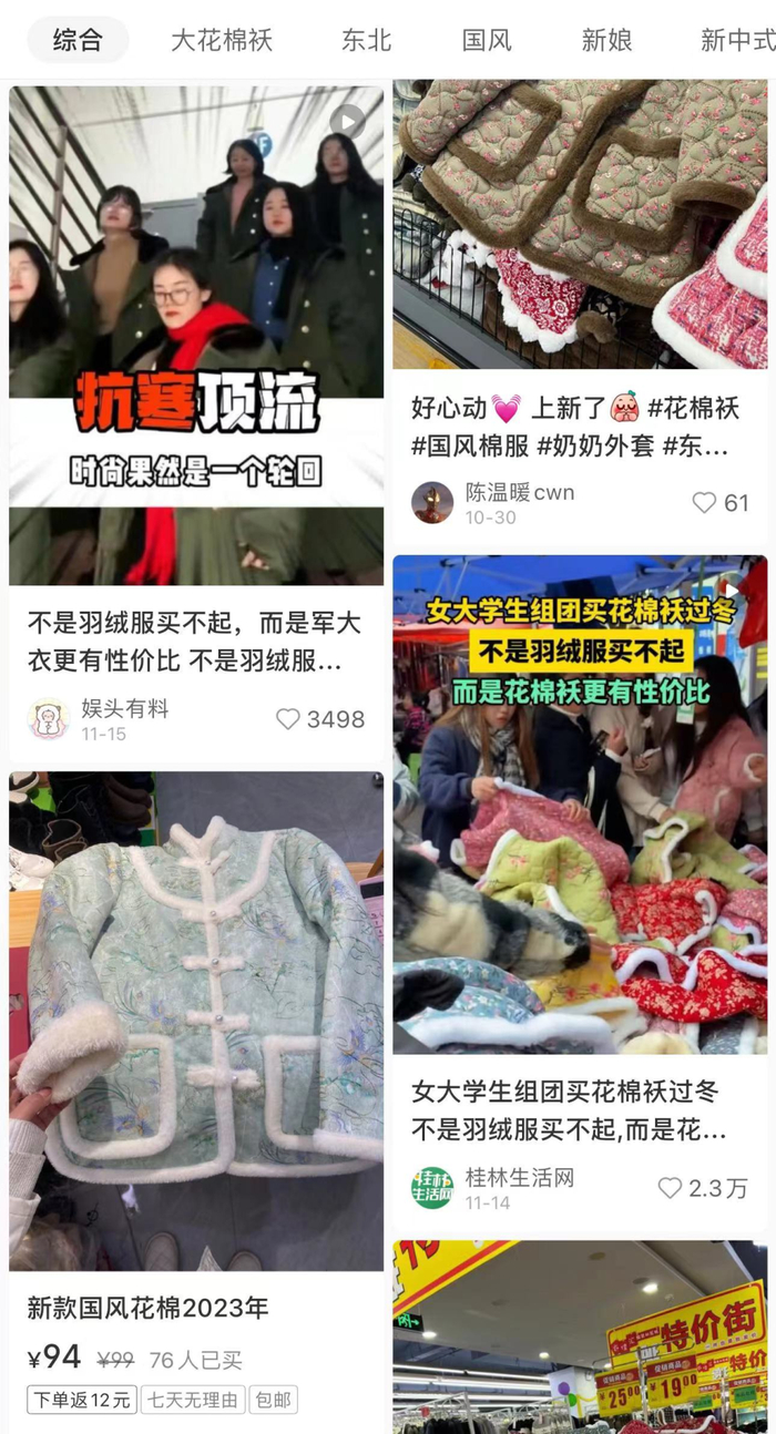 除了冲锋衣,大学生们还给出了过冬的另类潮流选项——军大衣、花棉袄。