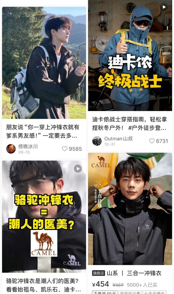截至11月22日,“冲锋衣”在小红书上有超149万篇笔记,而在不少新近的时尚街拍中,也能看到明星穿冲锋衣出街的照片。很多年轻人正是通过社交平台“种草”而“入坑”冲锋衣。