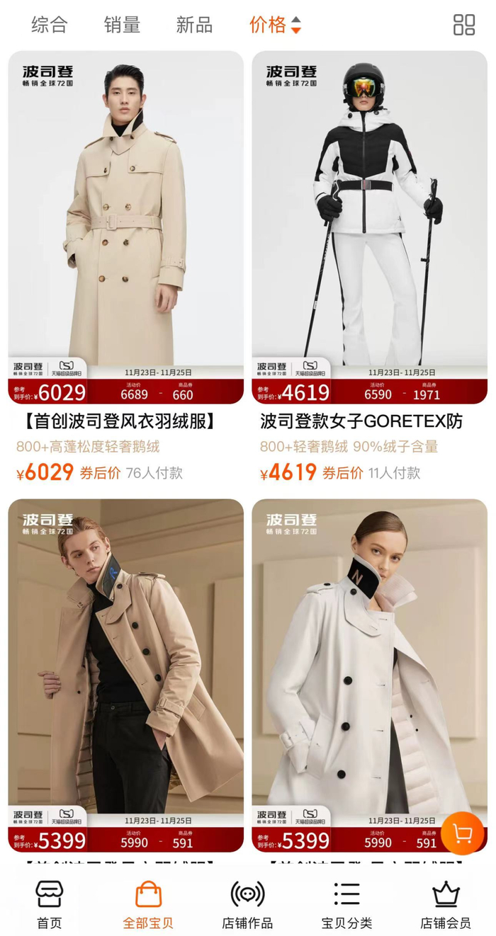 记者在搜索波司登天猫旗舰店后发现,其新品主要价格带在1500~3000元不等,新推出的风衣羽绒服、户外登山羽绒服等售价则超过6000元。