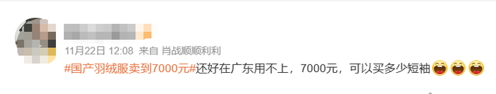 22日引发讨论的则是SKYPEOPLE天空人旗下的羽绒服,这一品牌定位中高端,其产品的主力价位在2800元~5000元,售价最高的羽绒风衣卖到7200元。
