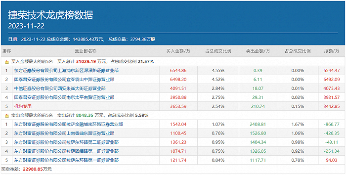 值得一提的是,除了以上三大知名游资罕见同框以外,11月22日捷荣技术还吸引到了机构资金的积极参与,有一个机构专用席位出现在该股买方第五位,买入金额为3653.59万元。