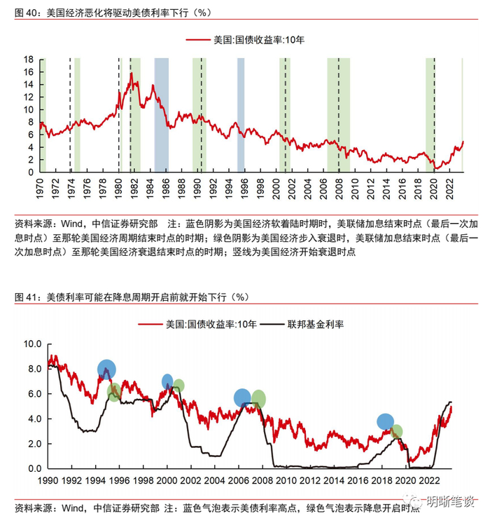 当前美债利率可能并未见顶,但2024年全年,美债有望明显受益于美国经济恶化风险和美联储货币政策转向。短期来看,中长端美债利率和短端利率以及联邦基金利率均有一定差距,参考以往加息周期中美债利率上行终点,预计中长端美债利率仍有进一步上行的空间,当前美债利率难言见顶。而进入2024年后,无论是美国经济恶化风险,还是美联储货币政策转向宽松的可能,均有望推动美债利率下行。参考历史上美联储货币政策转向时期的资产表现,预计美联储降息周期开启“前夕”将是中长端美债利率下行速度最快的时期。