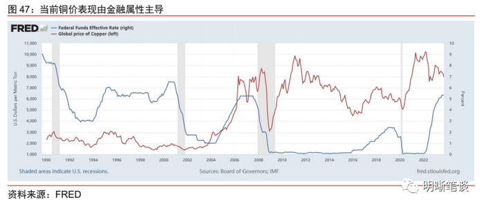 铜:预计明年在金融属性带动下中枢上行。铜是商品市场金融属性最强的品种之一,在2020年一轮的美联储超级量化宽松之后,以铜的金融属性更加明显。预计在明年年中前后美联储可能开启的降息周期带动下,铜的表现可能并不差。而从铜的商品属性看,需求端,新能源汽车、充电桩、光伏等新兴领域的发展有望形成新的对基本金属的需求拉升,供给端,虽然市场对明年供给端增量存在较强预期,但铜供给端还受到气候、生产国国内政治形势、铜矿工人罢工风险等多种因素的干扰,供给端也存在增长不及预期的风险。预计2024年铜价中枢有望小幅抬升。