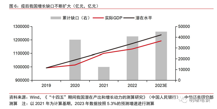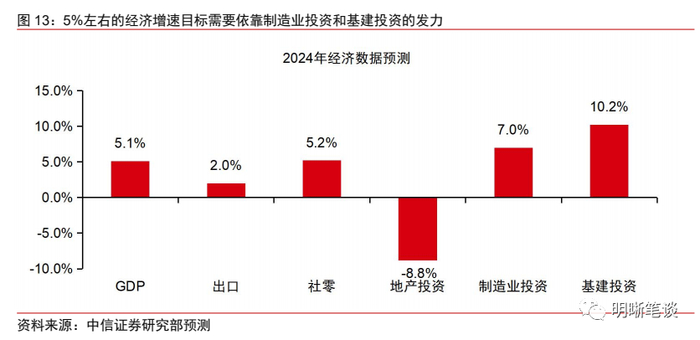 政策的短期与中长期诉求共同对2024年稳增长政策强度提出较高要求,预计2024年我国经济增速目标可能在5%左右,政策力度也不会弱于今年。短期来看,政策诉求可能在于维持明年经济的较高增长:从明年经济增长的结构性压力看,经济内生修复动能相对有限,政策发力带动制造业和基建投资增长是实现较高经济增速的前提;中长期来看,政策诉求可能在于推动我国经济增速向潜在水平回归:疫情以来,我国实际产出与潜在产出之间已经形成较大缺口,若经济增速持续大幅偏离潜在增速,则我国经济增速可能将面临持续快速下滑的压力,因此,明年政策发力的意义不仅在于维持经济短期内的较高增长,更在于对未来几年的增长中枢形成支撑。短期来看,我们判断明年经济增速目标可能不会低于今年,目标可能维持在5%左右,政策力度也可能不会弱于今年。而中长期来看,未来几年内,政策可能都会维持较为积极的基调,从而推动经济增速向潜在水平回归。