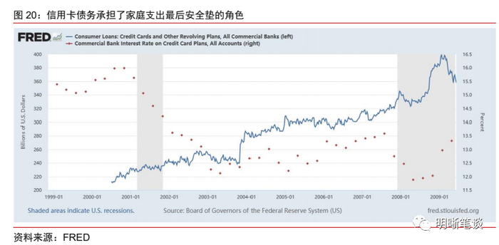美国经济所面临的另一大问题在于美国居民部门资产负债表或已经不再健康,其所支撑的消费增速也可能会逐步放缓,作为美国经济的重要支撑项,消费增长放缓后,美国明显恶化风险也将有所上升。疫情期间,美国极度宽松的财政政策使得居民部门超额储蓄快速累积,而超额储蓄消耗殆尽的时点频频晚于市场预期,背后的原因或在于信用卡扮演了居民部门金融状况恶化后的最后安全垫的角色。回顾历史可以发现,在2007-2008年由金融危机引发的大衰退前夕,美国居民部门的信用卡债务和循环贷款计划就出现了上行。并且在衰退中期,危机波及到居民部门金融状况时,再次出现了信用卡债务和循环贷款计划的上行。也就是说,当居民部门面临劳动力市场快速转入萧条状况时,会选择临时性增加信用卡债务以应对支出刚性,并且这种支出一般是暂时性的——卡贷存量在衰退中均出现了回落。