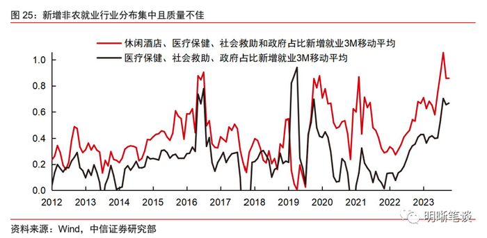 新增非农就业的行业过于集中,增长总量数据可能高估了劳动力市场热度。美国新增非农就业尽管持续下降,但总量仍然远高于疫情前水平。不过我们详细拆解新增就业的行业构成就能发现,连续三个月超八成的新增就业来自休闲酒店、医疗保健和社会救济、政府雇佣,其中后两者就占比超七成。今年年初至夏季的新增非农就业更多是由酒店休闲业完成,尚且可以解释为居民在放开社交距离管控后对积压休闲需求的释放。但当前新增就业结构中,医疗保健与社会救济的新增可能对应着长新冠影响,而政府雇佣则是逆周期托举就业的重要因素。因此尽管10月新增非农数据显示的是美国劳动力市场可能刚刚转向疲软,但是从结构拆分来看,这种趋势在更久之前或许就已经比较明确。来自医疗保健、社会救助和政府的就业新增自然难以一直维持,美国劳动力市场的火热程度可能已经触及临界点,并可能将开启加速下行。