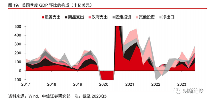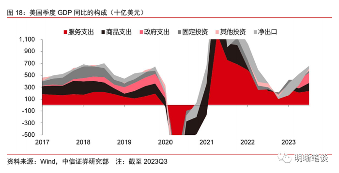 当前美国经济所面临的一大问题在于经济表现或许并不如数据所表现的那般具有韧性。今年前三季度,美国GDP的增长结构已经较三年疫情期间有所改变,这或许是美国经济增长动能整体开始回落的前兆。以支出法统计GDP,在三年疫情期间,主要为美国经济带来增量的是消费、除固定投资外的其他投资。但在近三个季度的GDP增长数据中,不论以环比还是同比口径来看,政府支出、消费都发挥了更加重要的增量贡献。其中服务消费对总量增长的贡献仍然显著,商品消费、政府支出的同比增速显著提高则更多源于低基数效应。而从环比来看,2023Q3美国商品消费的增长由非耐用品,特别是其中的处方药、娱乐用品和车辆增长,贡献。服务消费的增长主要由住房和公用事业、医疗保健、金融服务和保险、食品服务和住宿贡献。因此,虽然从总量上看,美国经济韧性似乎超出市场预期,但从结构上看,美国经济增长结构已经开始转变,而这或许是经济增长动能整体开始回落的前兆。