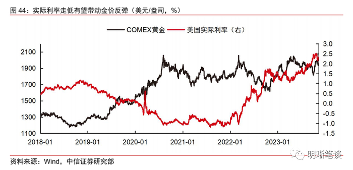 黄金价格的主要走势遵循美联储货币政策节奏和经济趋势的影响。美联储降息有望带来美国实际利率的快速改善,黄金的金融属性决定了黄金有望从中受益。而美国经济恶化风险可能加强黄金的避险价值。此外,明年是“超级大选年”,全球地缘政治形势面临较大的不确定性。如果局部地缘政治局势再度升温,可能进一步压制投资者风险偏好,这同样有望提振黄金价格。在金融属性和避险情绪共振的影响下,预计2024年黄金价格有望迎来震荡上行。