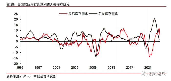 实际库存周期显示美国经济已经开始走弱。库存周期通常约3年为一个周期,大致可以分为去库存阶段和补库存阶段。由于当前通胀因素扰动明显,我们采用扣除价格影响的实际库存进行衡量,可以发现实际库存周期已经进入了主动去库阶段,按照周期规律,与经济明显恶化对应的被动去库阶段即将在明年年中左右到来。