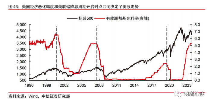 历史上,美联储加息周期停止前后,由于美国经济恶化阶段往往并未开启,因此,美股往往也会有所上行。而由于历史上的降息周期开启时点往往与美国经济恶化到来时点相近或略早于恶化时点,因此,降息周期开启后,美股往往会经历一段时期的下行并定价经济恶化,随后再转向上行。在这一阶段,美股向下的幅度和美国经济恶化的幅度高度相关。参照历史经验,短期内来看,在2024年一季度乃至整个上半年,预计美股表现都将受到美国经济恶化风险的拖累,但由于本轮美国经济恶化幅度不至于太深,预计美股下跌幅度也可能较为有限。而待到降息周期开启后,美股可能逐步转向回升。因此,2024年美股可能呈现先下后上走势,具体拐点则需进一步观察经济恶化和降息的确认时点。