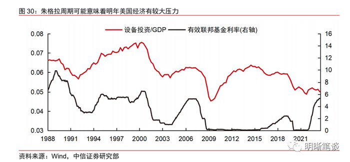 朱格拉周期同样显示美国经济在明年面临较大的恶化压力。朱格拉周期通常10年为一个周期,美国历史上的朱格拉周期的衰退期通常对应着NBER定义的衰退,且周期位置更加滞后。朱格拉周期是由企业生产的设备更新造成的。即这是一种经济内生规律。但本轮的不同之处在于,由于疫情的外生冲击2020年美国经济出现了短暂的衰退。但是由外生冲击带来的设备投资降低并不能够替代经济内生周期的出清效果,疫情的冲击造成的是生产和消费的共同下滑,设备实际更新周期因此可以延长。可以看到的是在此之后尽管美国通过了多项投资刺激法案,设备投资一直在低位徘徊。由此可以推断,上一轮朱格拉周期并未结束,接下来仍有可能看到美国经济经历由经济内生决定的明显恶化。但是由于朱格拉周期时间较长,指标滞后,且有外生冲击的干扰,我们并不能够准确判断周期位置何时开始明显恶化,但按照目前趋势演化,发生在明年的可能性不容小觑。
