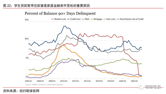 学生贷款偿还的重启将进一步恶化居民资产负债表。存量约1.57万亿美元的学生贷款目前是仅次于车贷的美国居民部门第二大非按揭贷款。疫情期间,由于美国学生贷款偿还的暂停,居民部门违约率整体有所下行,资产负债表也随着改善。不过,学生贷款偿还的暂停和美国大规模的财政补贴等多因素共同作用,也在一定程度上导致了居民消费支出的上行和储蓄率的低位徘徊。而美国两党斗争已经导致美国学生贷款的偿还于今年10月重启,因此,消费支出上行的趋势可能随之逆转,居民部门资产负债表也可能雪上加霜。