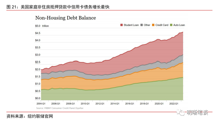 根据纽约联储最新的统计数据,尽管2023Q2美国居民部门负债中的住房贷款这一项并没有没有环比增长,但居民部门的负债总规模仍在扩张,而其中贡献最大的分项正是信用卡贷款,单季环比增速高达4.6%。虽然在美国积极财政政策的支撑下,2021年下半年信用卡违约率达到了历史最低点约1.5%,但随后即进入了上行通道。而信用卡的信贷形式决定了,其短期内存量和违约率的快速上行意味着居民部门资产负债表恶化到了一定程度。因此,虽然短期内美国个人消费支出仍在延续增长,随着居民部门资产负债表的逐步恶化,消费对经济的支撑可能也难以长期持续。