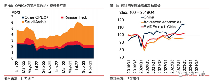 原油:不确定性和稀缺性所带来的做多机会。中国及东亚国家原油需求上涨可能将和欧美发达经济体经济大幅恶化风险所导致的原油需求下行对冲,因此,2024年原油需求可能呈现温和增长,油价中枢可能保持高位震荡。而生产端,由于OPEC+闲置产能并不高,预计供给端不会出现大幅扩张、甚至也不排除主要生产国在2024年减产的风险,因此,2024年原油供给端可能将面临较大的不确定性,需要关注供需关系阶段性紧张时期的原油做多机会。且地缘局势并不平静,全球多个热点地区的博弈正在升温,因此明年需要格外警惕地缘因素给原油价格带来的波动风险。