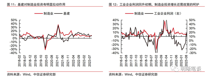 3)基建和制造业支撑经济复苏的前提在于政策发力,政策强度对经济复苏斜率的影响可能会更为显著,政策的阶段性释放可能带来经济的脉冲式复苏。剔除掉基数效应后,2024年的经济增长结构可能表现为基建、制造业扛起稳增长大旗,而消费和地产对经济支撑相对不足的格局。不过,基建和制造业扛起稳增长大旗的前提或在于稳增长政策的积极发力:一方面,基建强度取决于财政政策力度,制造业投资的增长也需要基建的拉动;另一方面,当前企业盈利周期处于回升初期,未来通胀改善和盈利周期修复的进程可能相对温和,且从企业盈利改善向制造业投资改善尚需要一定的传导时间,因此,制造业投资的增长也需要政策呵护。因此,2024年的政策发力节奏决定了基建和制造业增长动能、进而决定了明年的经济复苏进程。从近几年的政策发力规律来看,政策在发力之后往往会进入观察期,随后视经济恢复动能决定政策再度发力与否,因此,预计明年政策更可能在发力期和观察期间反复切换,而不是在某一时点集中释放,预计随着政策的阶段性释放,经济有望迎来脉冲式复苏,复苏进程更可能是波浪式的,而较难一帆风顺。