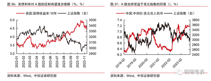 海外:美国经济恶化和美联储降息带来资产的上、下半场。2024年预计美股和美债的主要定价逻辑都将经历从美国经济恶化到美联储降息的切换,在经济恶化、年中前后降息的基准假设情形下,预计全球流动性转松会对美股带来一定提振。而经济恶化和美联储降息对美债均是利好,但美国财政政策缺乏退出路径可能导致美债利率难回前低。