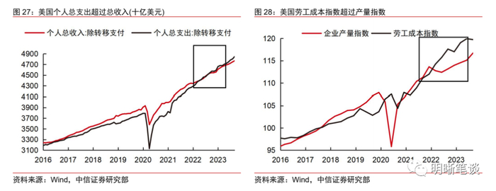 加息对美国经济的滞后性负面冲击将逐步显现,经济恶化终将到来。综合经济与劳动力市场情况,可以看到加息对美国经济的负面冲击已经逐步显现。加息与高通胀并存的影响是:金融部门的紧缩阻碍了实体经济的扩张速度。从企业的视角来看,员工的工作时间增长慢于总薪资增长,劳工成本增长又快于产量增长。在没有技术突破和生产力提高,且信贷成本逐渐提高的情况下,企业利润正在减少。从居民部门视角来看,不考虑转移支付的个人总支出增速高于总收入,且绝对值也出现反超,即家庭部门的货币计价财富在流失。家庭与企业部门的现金流循环无法维持,逐步萎缩,通胀与加息的同时存在让这一过程变得不可持续。因此,在美国经济读数繁荣的背后,增长的内生动能可能已经较为疲软,经济恶化可能即将到来。