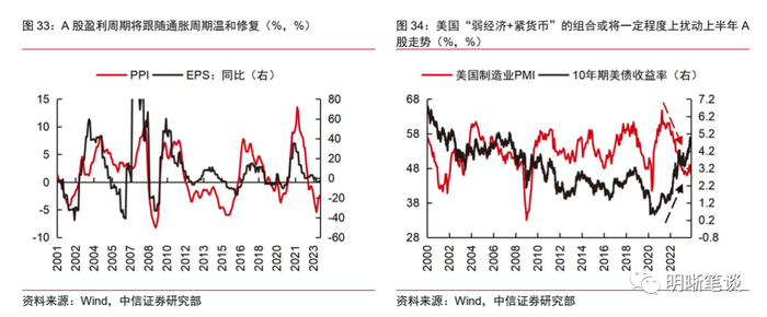 股市的修复行情或分为两阶段。第一阶段股市的主要矛盾在于国内经济温和修复与海外经济恶化风险加剧的冲突,股市可能呈现波浪式上行行情。明年上半年前后或为A股修复行情的第一阶段。这一阶段国内的主要矛盾在于经济周期延续触底回升趋势,A股盈利周期有望跟随通胀周期逐步修复。不过,在经济复苏的结构性特征和偏弱内生修复动能的影响下,经济的内生性修复高度相对有限,因此,稳增长政策的力度或将是决定经济修复强度和市场风险偏好的重要变量;而这一阶段海外的主要矛盾在于,高利率之下,美国或将难以避免地在年中附近明显恶化,因此,不论是逐步减弱的美国经济增长动能和依旧偏紧的美联储货币政策,又或者是美国经济恶化风险下海外股市可能的偏弱表现,都将对A股运行造成一定负面扰动。整体而言,宏观环境向好趋势有望推动A股底部逐步抬升,但偏弱的内生修复动能和海外不利因素的冲击将制约这一阶段A股反弹的高度,破局点或在于国内的政策强度,而政策的阶段性释放预计将带动经济复苏斜率的波浪式回升,因此,上半年前后,A股可能呈现波浪式上行的行情。