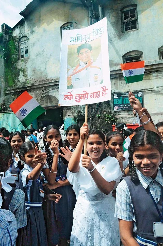 2008年8月15日,在印度孟买,小学生举着射击运动员宾德拉的画像参加印度独立日庆祝游行。宾德拉 2008年8月11日在北京奥运会男子10米气步枪比赛中,为印度获得其历史上第一枚奥运会个人项目金牌,成为印度青少年崇拜的偶像。文建摄/本刊