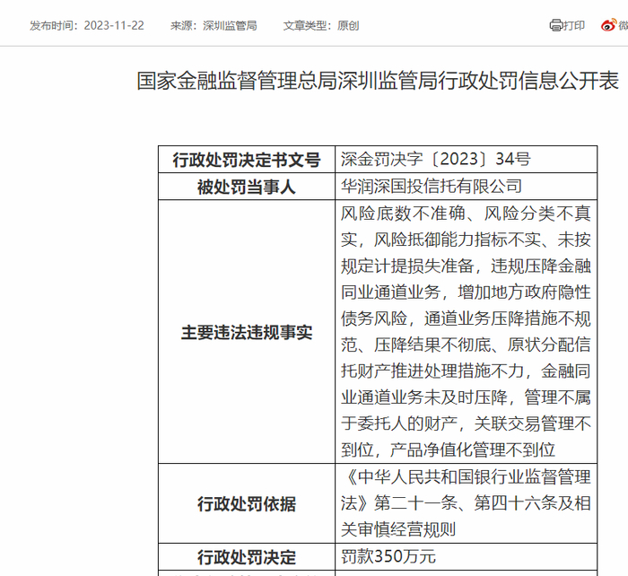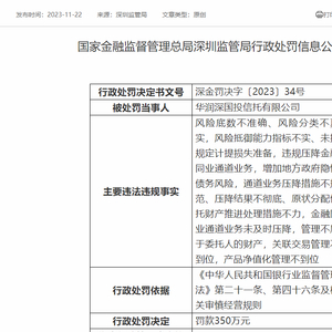 11月22日,国家金融监督管理总局深圳监管局披露行政处罚决定书,华润深国投信托有限公司被罚350万元,4名责任人被予以警告。