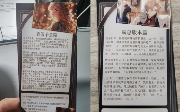 “看了这么多年网文,总算发挥了点作用,已经写了真假千金、童话、霸总、玛丽苏、爽文等6个版本的故事了,有些老顾客集齐了卡片还催我出新的。”