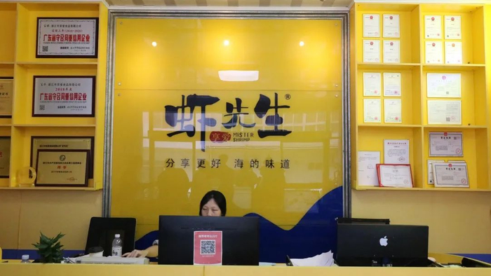 始于干虾,品类逐步扩充,现在公司拥有10多项专利和版权,旗下有虾先生、虾先生的海礼、虾小姐和湛牌等各类农产品品牌,展柜上摆放的包装盒定调红黄蓝色系,十分有冲击力,一眼就让人联想到湛江的黄金海岸。