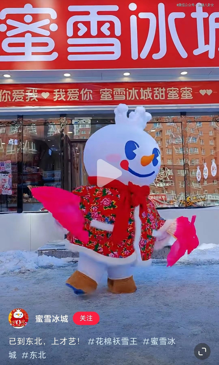 学生穿完之后,东北的蜜雪冰城雪王也换上了花棉袄,算是入乡随俗了。