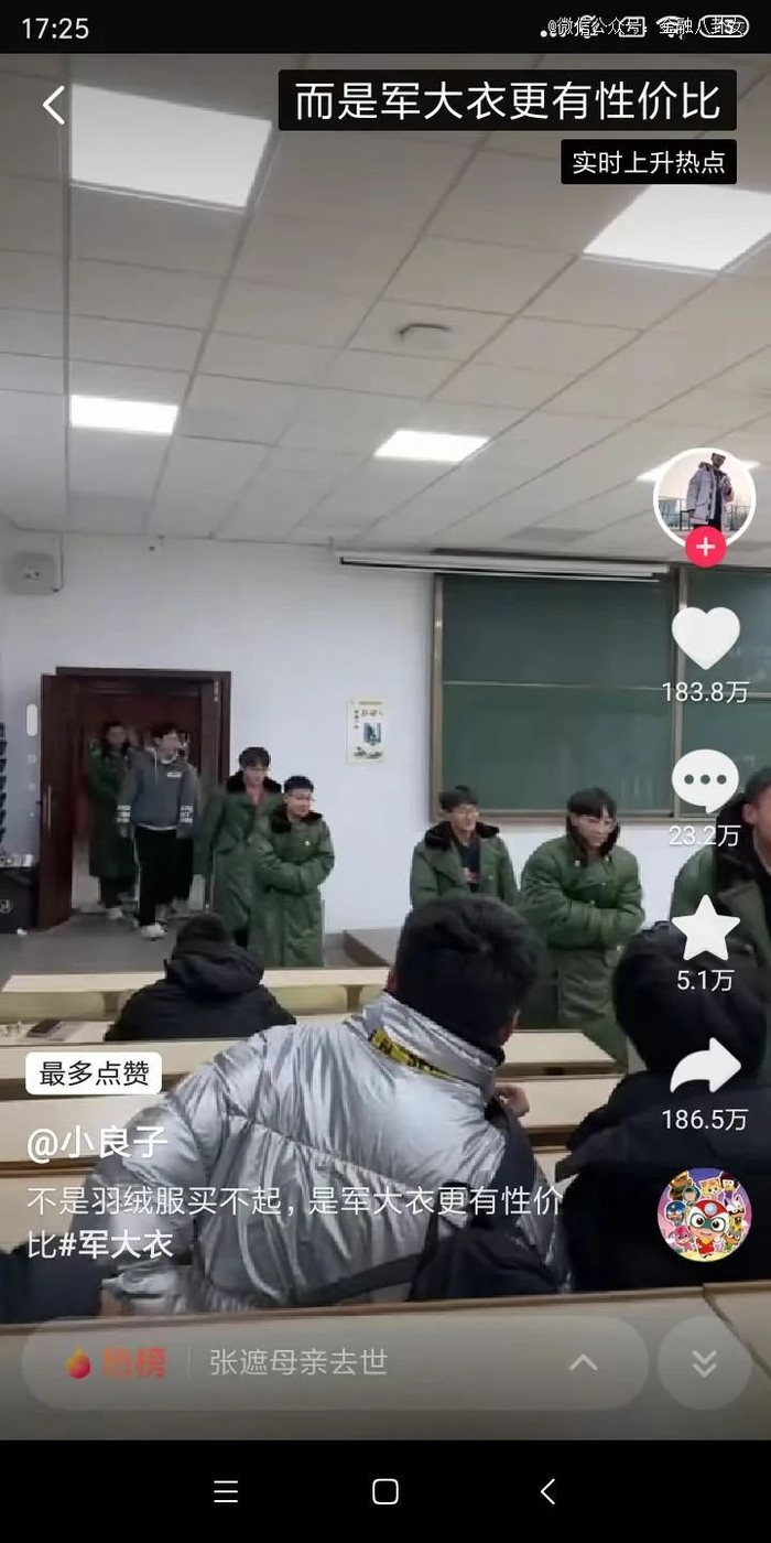 短视频平台上,词条“不是羽绒服买不起,而是军绿色棉大衣更有性价比”有超过1900万人在看。